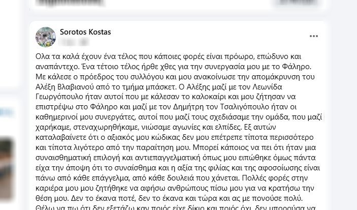 «Ολα τα καλά έχουν ένα τέλος που κάποιες φορές είναι πρόωρο, επώδυνο και αναπάντεχο. Ένα τέτοιο τέλος ήρθε χθες για την συνεργασία μου με το Φάληρο. Με κάλεσε ο πρόεδρος του συλλόγου και μου ανακοίνωσε την απομάκρυνση του Αλέξη Βλαβιανού από το τμήμα μπάσκετ. Ο Αλέξης μαζί με τον Λεωνίδα Γεωργόπουλο ήταν αυτοί που με κάλεσαν το καλοκαίρι και μου ζήτησαν να επιστρέψω στο Φάληρο και μαζί με τον Δημήτρη τον Τσαλιγόπουλο ήταν οι καθημερινοί μου συνεργάτες, αυτοί που μαζί τους σχεδιάσαμε την ομάδα, που μαζί χαρήκαμε, στεναχωρηθήκαμε, νιώσαμε αγωνίες και ελπίδες. Εξ αυτών καταλαβαίνετε ότι ο αξιακός μου κώδικας δεν μου επέτρεπε τίποτα περισσότερο και τίποτα λιγότερο από την παραίτηση μου», αναφέρει στο κείμενο που ανήρτησε στον προσωπικό του λογαριασμό ο Έλληνας προπονητής και συνεχίζει: «Μπορεί κάποιος να πει ότι ήταν μια συναισθηματική επιλογή και αντιεπαγγελματική όπως μου ειπώθηκε όμως πάντα είχα την άποψη ότι το συναίσθημα και η αξία της φιλίας και της αφοσοίωσης είναι πάνω από κάθε επάγγελμα, από κάθε δουλειά που χάνεται. Πολλές φορές στην καριέρα μου μου ζητήθηκε να αφήσω ανθρώπους πίσω μου για να κρατήσω την θέση μου. Δεν το έκανα ποτέ, δεν το έκανα και τώρα και ας με πονούσε πολύ.